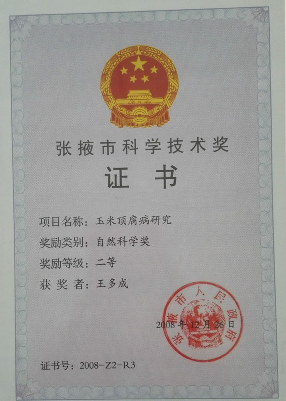 2008年榮獲張掖市科學技術(shù)二等獎證書