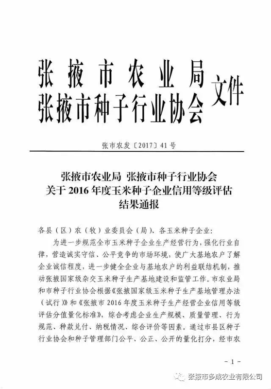 熱烈祝賀張掖市多成農(nóng)業(yè)有限公司被評為2017年度信用等級AAA級企業(yè)! 2017年2月24日,張掖市農(nóng)業(yè)局、張掖市種子行業(yè)協(xié)會公布的《2016年度玉米種子企業(yè)信用等級評估結(jié)果》中,張掖市多成農(nóng)業(yè)有限公司被評為2016年度信用等級AAA級企業(yè)。 |