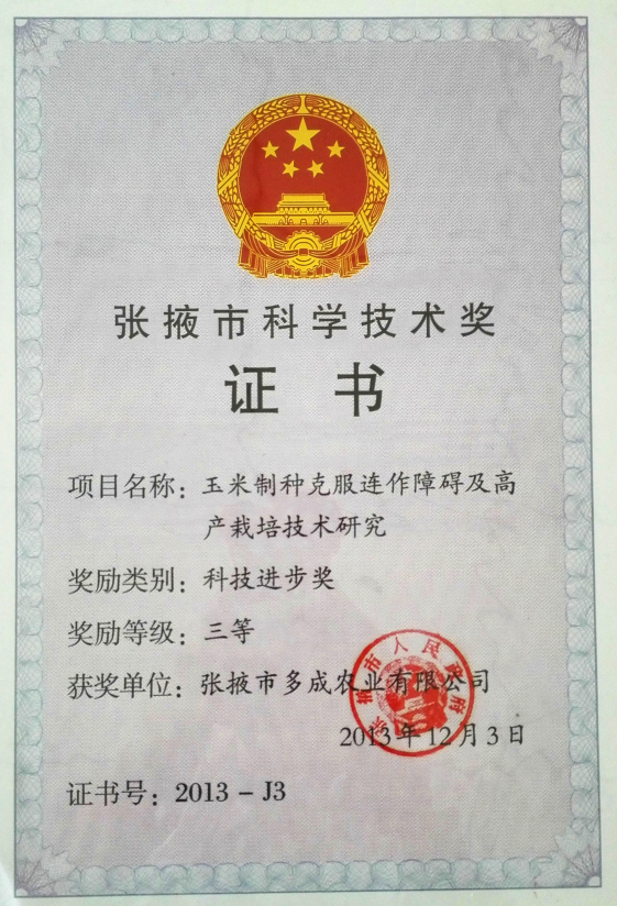 | 玉米制種克服連作障礙及高產(chǎn)栽培技術(shù)研究市科學(xué)技術(shù)獎(jiǎng)三等獎(jiǎng) | ||